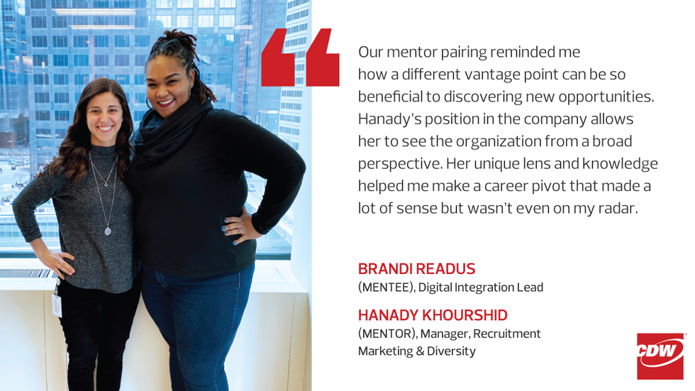 “CDW Business Resource Groups are a key source for networking and mentoring opportunities. In 2019, our BeU BRG launched a formal mentoring program through their Project IMPACT initiative aimed at recruiting, retaining and promoting Black coworkers. It has been a successful program that has brought coworkers together across departments and roles, sharing new experiences and perspectives for both mentors and mentees.”
