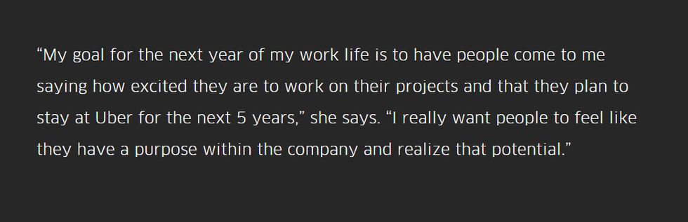 "I saw a stark difference between how Uber was portrayed in the headlines and what I experienced first-hand working with passionate, wonderful, and positive humans," she says. "I wanted to create a positive impact and change for people at Uber—and the people who come into contact with Uber as a company."