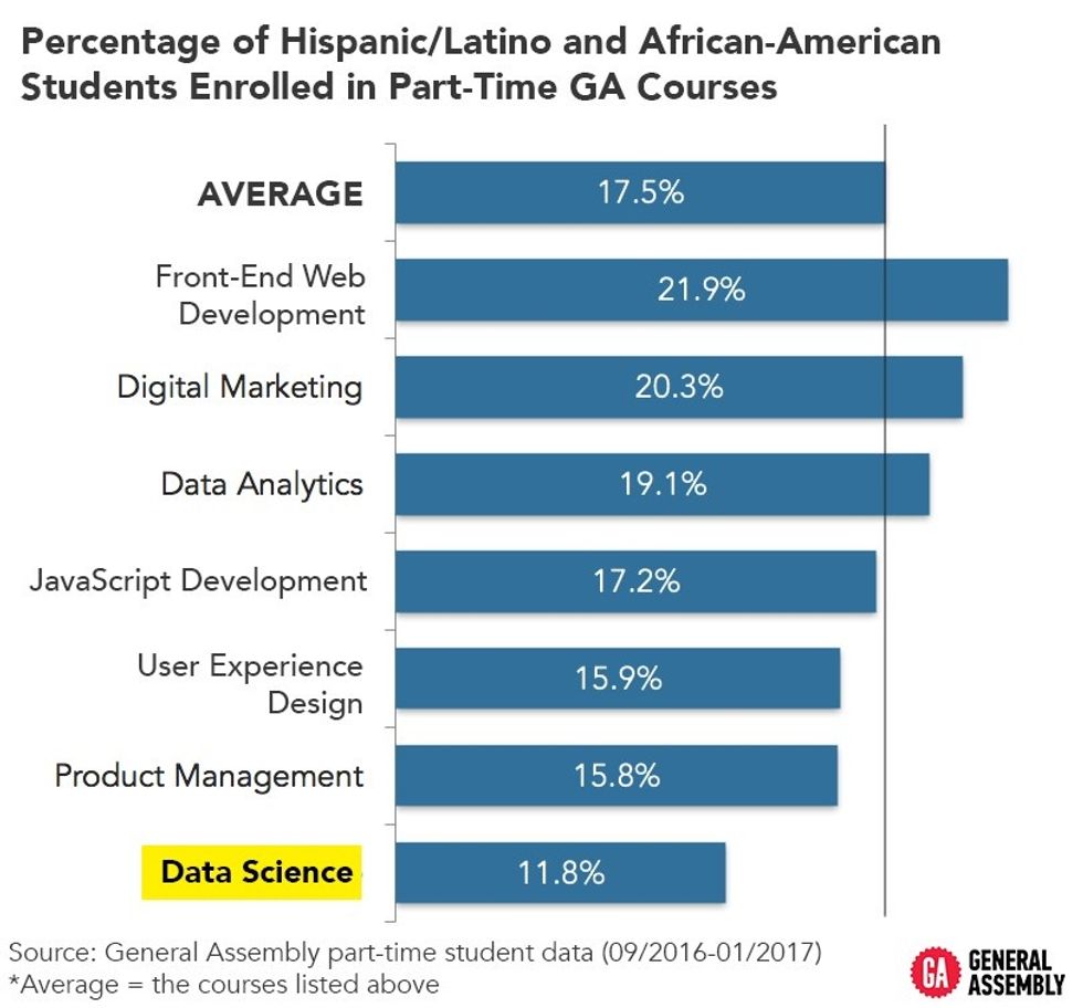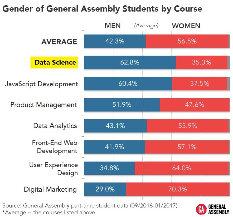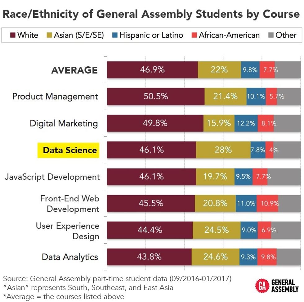 Looking at GA data for our part-time programs (which typically reach students who already have jobs and are looking to expand their skill set as they pursue a promotion or a career shift), here's what we found: While great strides have been made in fields like web development and user experience (UX) design, data science — a relatively newer concentration — still has a ways to go in terms of gender and racial equality.