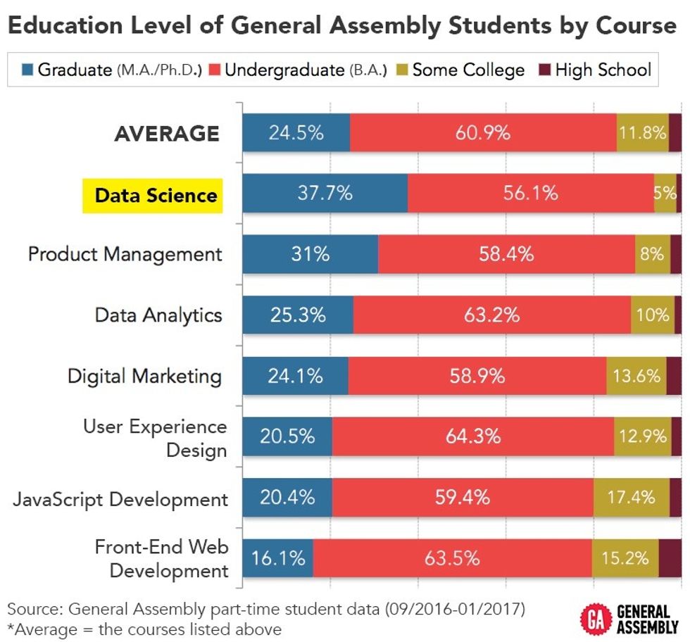Across all courses, 85.4% of part-time GA students have a bachelor's degree or higher; in Data Science, that figure is 93.8%. This seems to largely be driven by the fact that there are far more master's and Ph.D. graduates in Data Science (37.7%) than the overall average (24.%). A surprisingly high 3.7% of students hold a Ph.D. — more than triple the average of 1.2%.