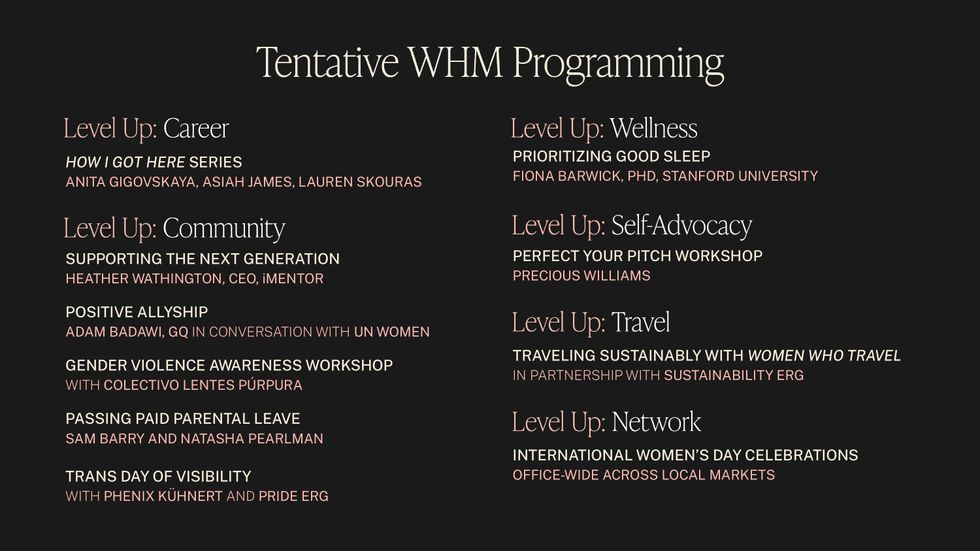 Condé Nast's Women's Network is offering programming all month long covering topics like supporting the next generation, positive allyship, and how to perfect your pitch.