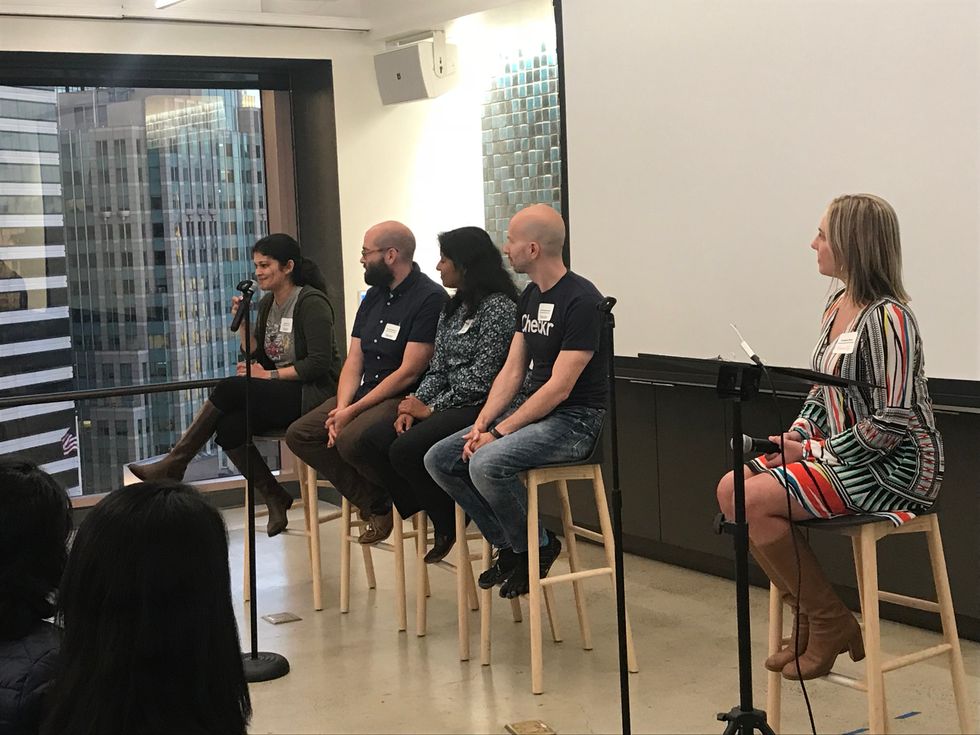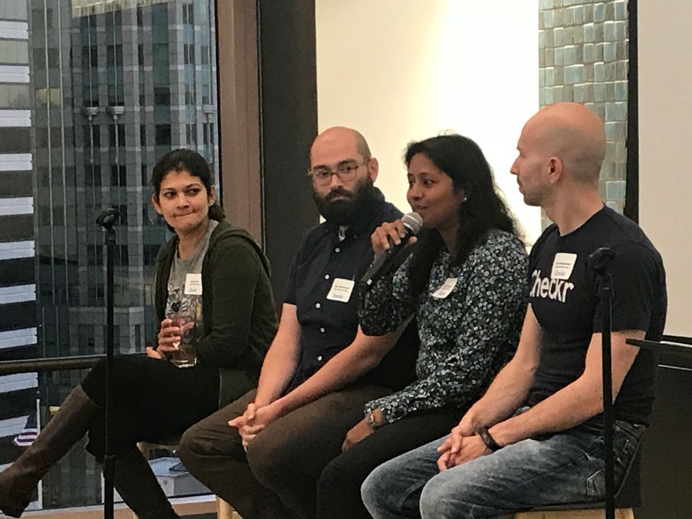 Checkr's Ritu Vincent, Ben Jacobson, Anusha Rajan, and Eric Psalmond with PowerToFly moderator Cristina Duke.