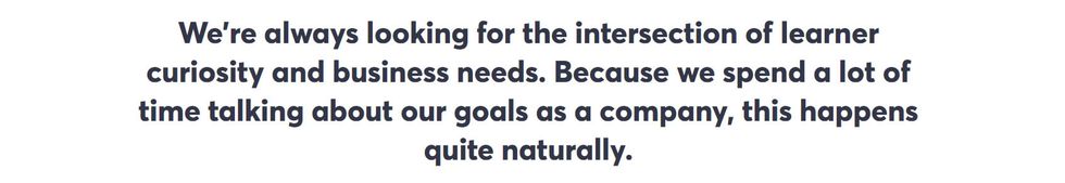 We're always looking for the intersection of learner curiosity and business needs. Because we spend a lot of time talking about our goals as a company, this happens quite naturally.